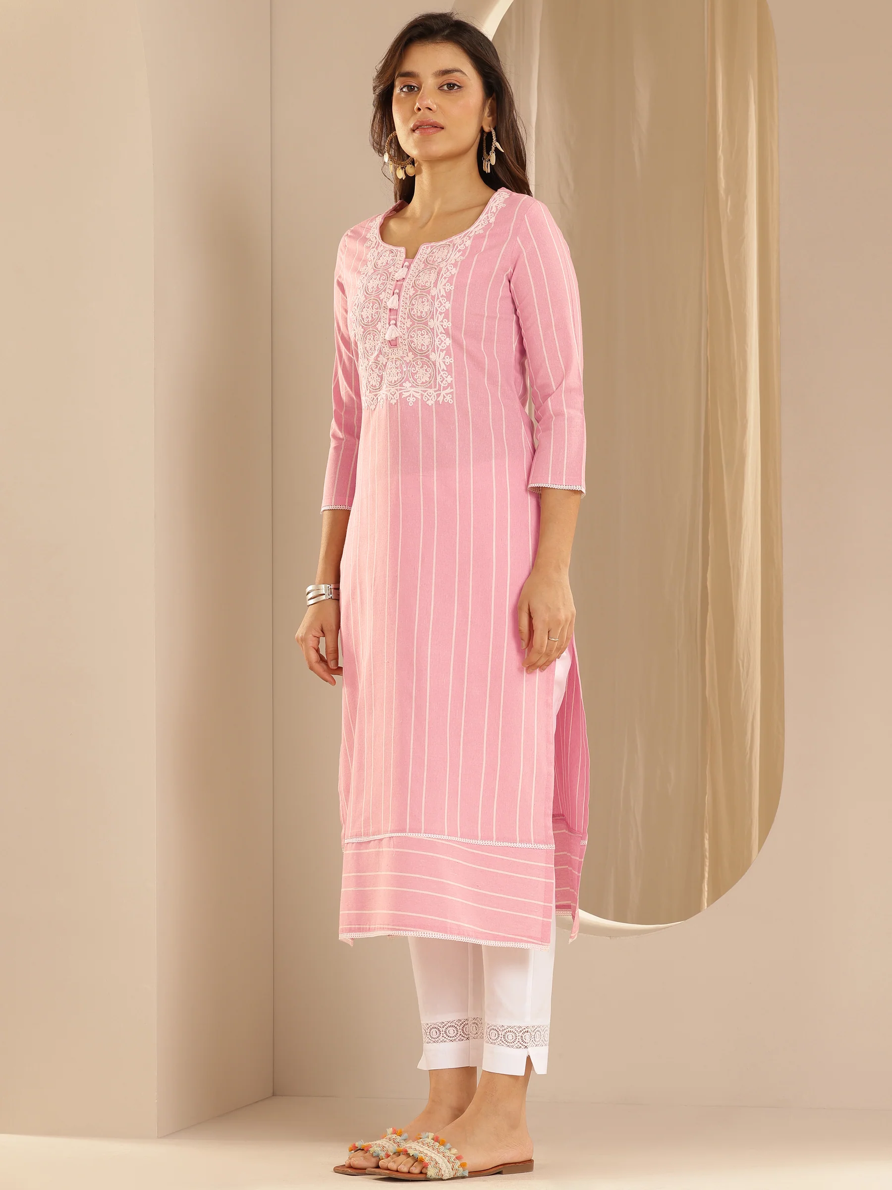 Pink Embroidered Cotton Blend Straight Kurta